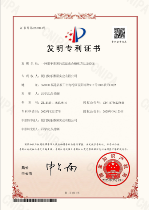 近日,快樂番薯更是公布了一項與番薯相關(guān)的專利——“一種用于番薯的高溫愈合糖化方法及設(shè)備(專利號:ZL 2023 1 1827381.6)”。“一種用于番薯的高溫愈合糖化方法及設(shè)備”:通過精準(zhǔn)溫控與愈合工藝優(yōu)化,提升番薯甜度,同時提升番薯表皮硬度,解決傳統(tǒng)番薯加工中 “甜度不均、易腐壞、損耗高” 的難題,使門店番薯原料損耗率得到降低。