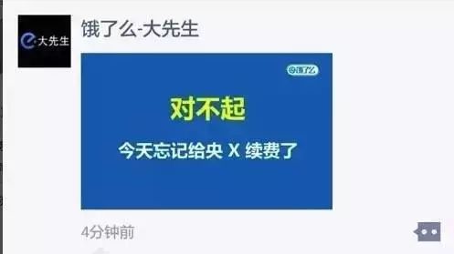 與此同時(shí),在微信朋友圈里,開(kāi)始瘋傳一幅截圖,顯示一個(gè)名為“餓了么-大先生”的個(gè)人微信號(hào)發(fā)送了一張藍(lán)底圖片,上寫(xiě)“對(duì)不起,今天忘記給央X續(xù)費(fèi)了”,言語(yǔ)中滿含譏諷央視收取保護(hù)費(fèi)之意。